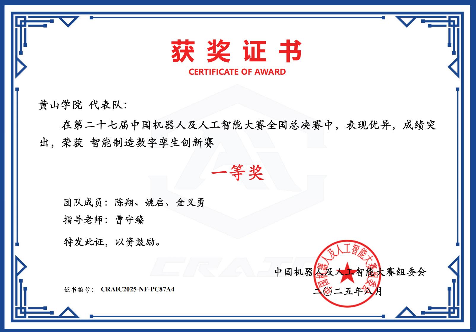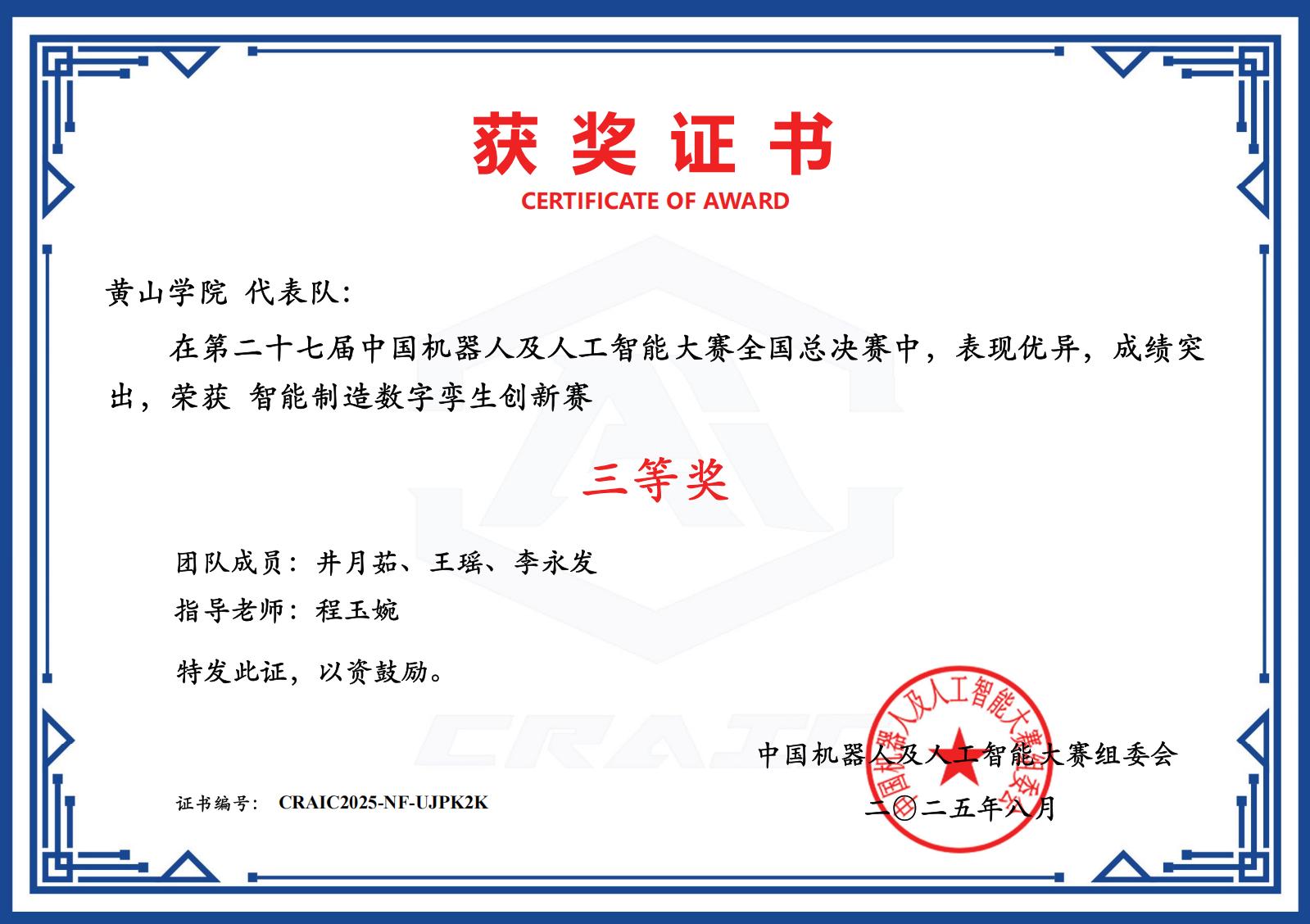 8月5日,第二十七届中国机器人及人工智能大赛全国总决赛圆满落幕。77779193永利官网“恐龙救援队”和“三角函数队”代表学校参加智能制造数字孪生创新赛道的角逐,最终“恐龙救援队”荣获一等奖,“三角函数队”获得三等奖。