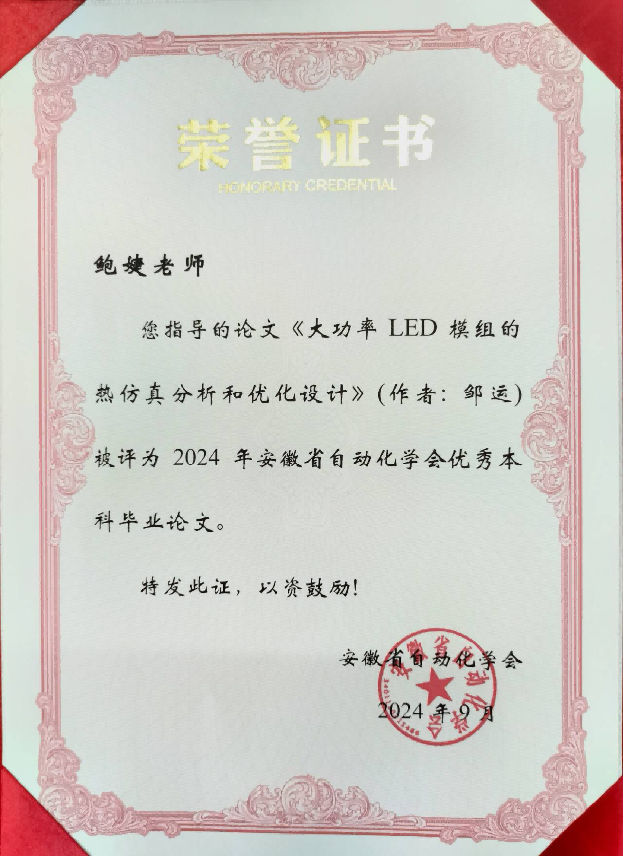 近日,由安徽省自动化学会主办的“2024年安徽省自动化产业与技术大会”在泾县隆重召开。会上公布了安徽省高校自动化领域的多个重要奖项,我院鲍婕教授指导的2024届自动化专业毕业生邹运的论文《大功率LED模组的热仿真分析和优化设计》荣获优秀本科毕业论文奖。这是我院教师第一次获得该项荣誉。