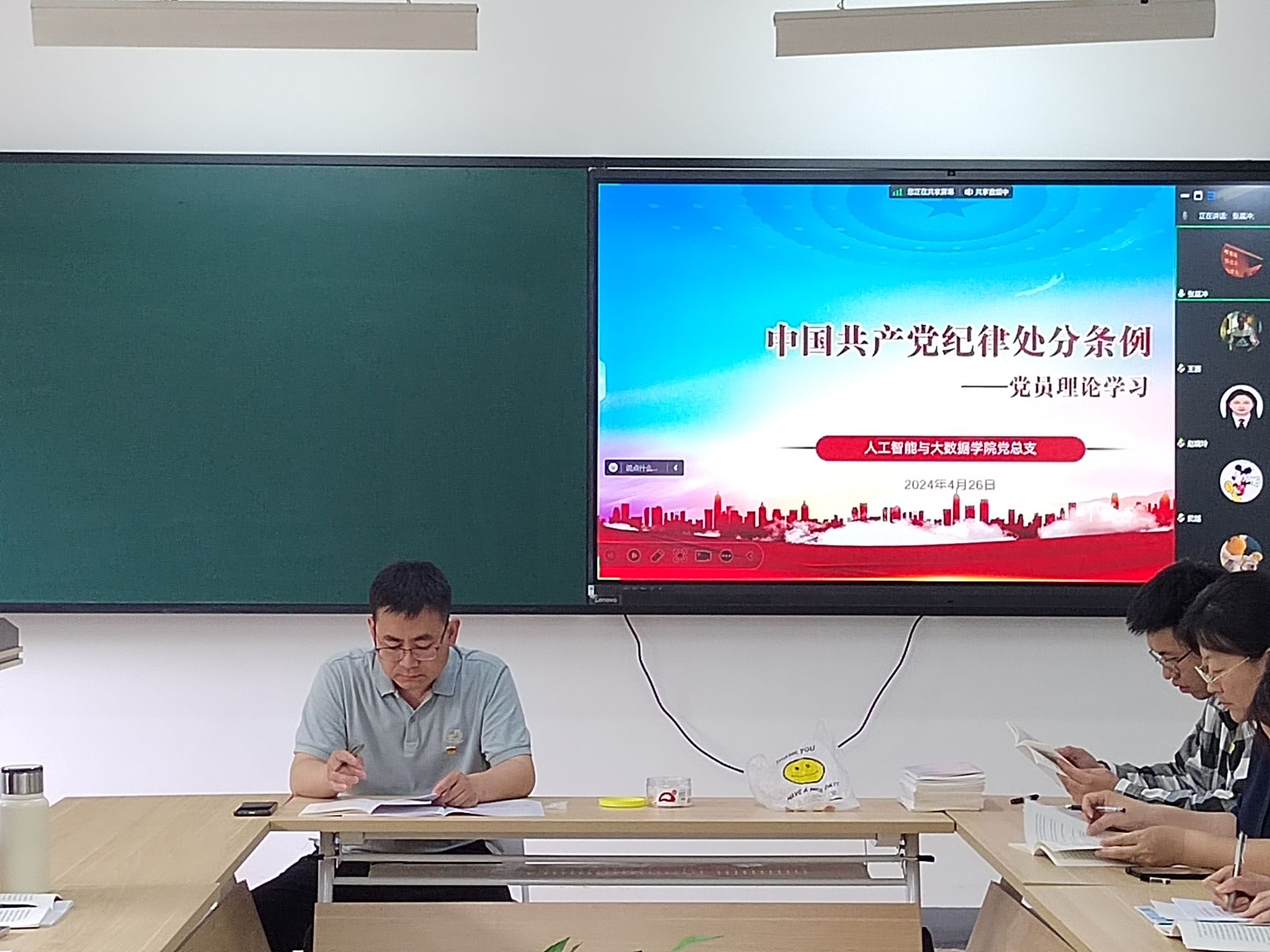 2024年4月26日下午13:30,人工智能与大数据学院党总支以支部为单位,在次教216会议室召开了党员理论学习专题会议,本次会议由人工智能与大数据学院党总支书记、学管副院长尹钧主持召开,参与人员有教工支部和学生支部全体成员,线上和线下同时进行。