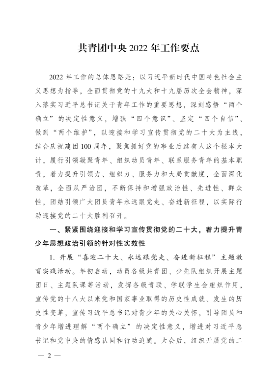 共青团中央关于印发 《共青团中央 2022 年工作要点》 的通知