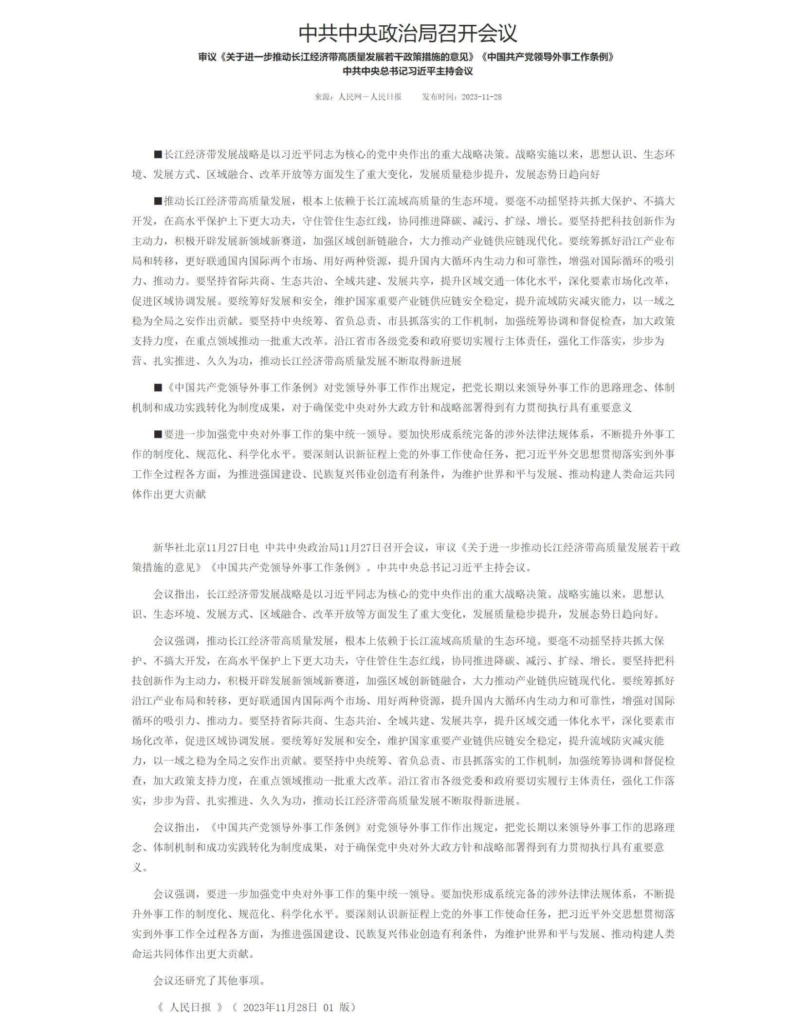 新华社北京11月27日电 中共中央政治局11月27日召开会议,审议《关于进一步推动长江经济带高质量发展若干政策措施的意见》《中国共产党领导外事工作条例》。中共中央总书记习近平主持会议。