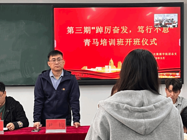 为深入学习习近平新时代中国特色社会主义思想和党的二十大精神,扎实推进青年马克思主义者培养工程,提高青年学生的理论素养和实践水平,培养勇于担当大任的新时代青年。人工智能与大数据学院于2023年3月20日12:15在主教1-1和1-2教室举行第三期“踔厉奋发,笃行不怠”青马培训班开班仪式。参会人员有人工智能与大数据学院党总支书记兼学管副院长尹钧,团总支书记王珊,招生就业办公室主任孟鑫,团总支学生副书记段鹏飞、青马管理中心主任刘宇轩以及全体青马培训班学员。