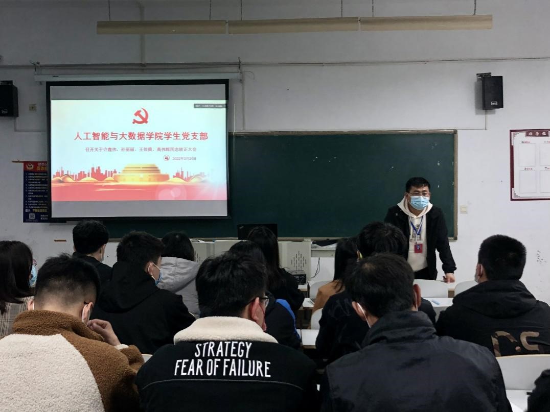 为进一步加强学生党员队伍建设,积极推进河北工程技术学院人工智能与大数据学院党建工作,2022年3月24日晚19:00,人工智能与大数据学院2022年上半年学生党支部预备党员转正大会于主教104教室召开,讨论关于许鑫伟、孙丽丽、王佳爽、高伟辉4位预备党员申请转为正式党员事宜。此次会议由学院党总支书记、学管副院长尹钧主持,学生支部全体教师党员与学生党员参加此次会议,会议采用了线上、线下结合的方式进行。