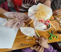 另一课堂开展的是“垃圾分类,变废为宝”手工小课堂,本期手工课堂主题为“口罩花”,志愿者和小朋友们围坐在一起,使用了剪刀、吸管、绿色卡纸等将口罩重新利用,通过动手实践,制作出了一朵朵五彩缤纷的花朵,让原本简单的口罩变得鲜亮美丽,让学生有了更加强烈的学习和创作欲望。