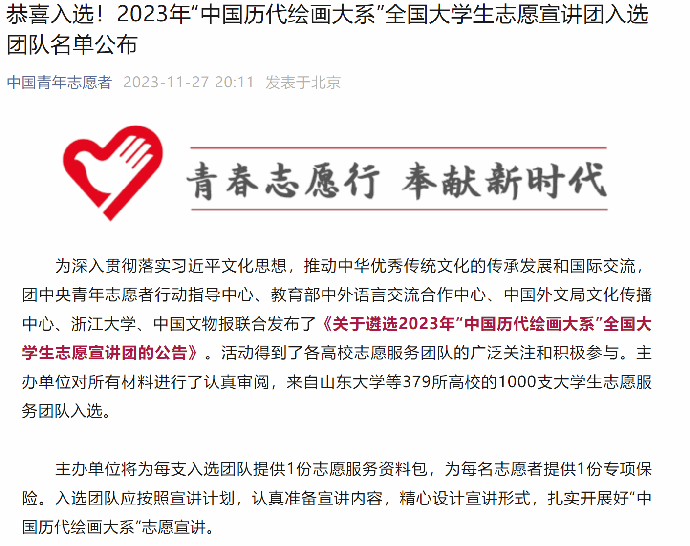 由团中央青年志愿者行动指导中心、教育部中外语言交流合作中心、中国外文局文化传播中心、浙江大学、中国文物报联合发布了《关于遴选2023年“中国历代绘画大系”全国大学生志愿宣讲团的公告》。BEAT365官网“小智公益团队”和“心理健康协会团队”成功入选全国1000支大学生志愿服务团队。
