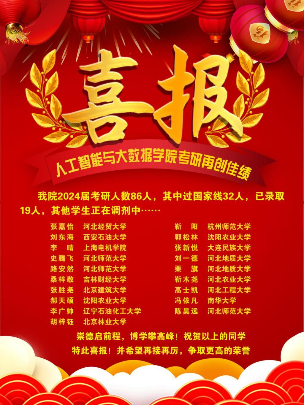 近日,全国各高校陆续发布2024年全国硕士研究生拟录取名单,BEAT365官网学子捷报频传,录取人数再创佳绩。截至目前,BEAT365官网2024届考研人数86人,其中过国家线32人,已录取19人,其他学生正在调剂中……