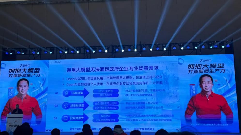 周鸿祎以“拥抱大模型,打造新质生产力”为主题,为与会者带来了一场精彩纷呈的演讲。他详细阐述了人工智能大模型在数字经济时代的重要性和广泛应用价值,从自动驾驶、智能医疗到智慧城市,一个个生动的案例让人耳目一新,深入浅出地讲解更是让复杂的技术概念变得通俗易懂。周鸿祎的演讲不仅展现了人工智能大模型的无限潜力,更激发了大家对这一领域的浓厚兴趣和热情。