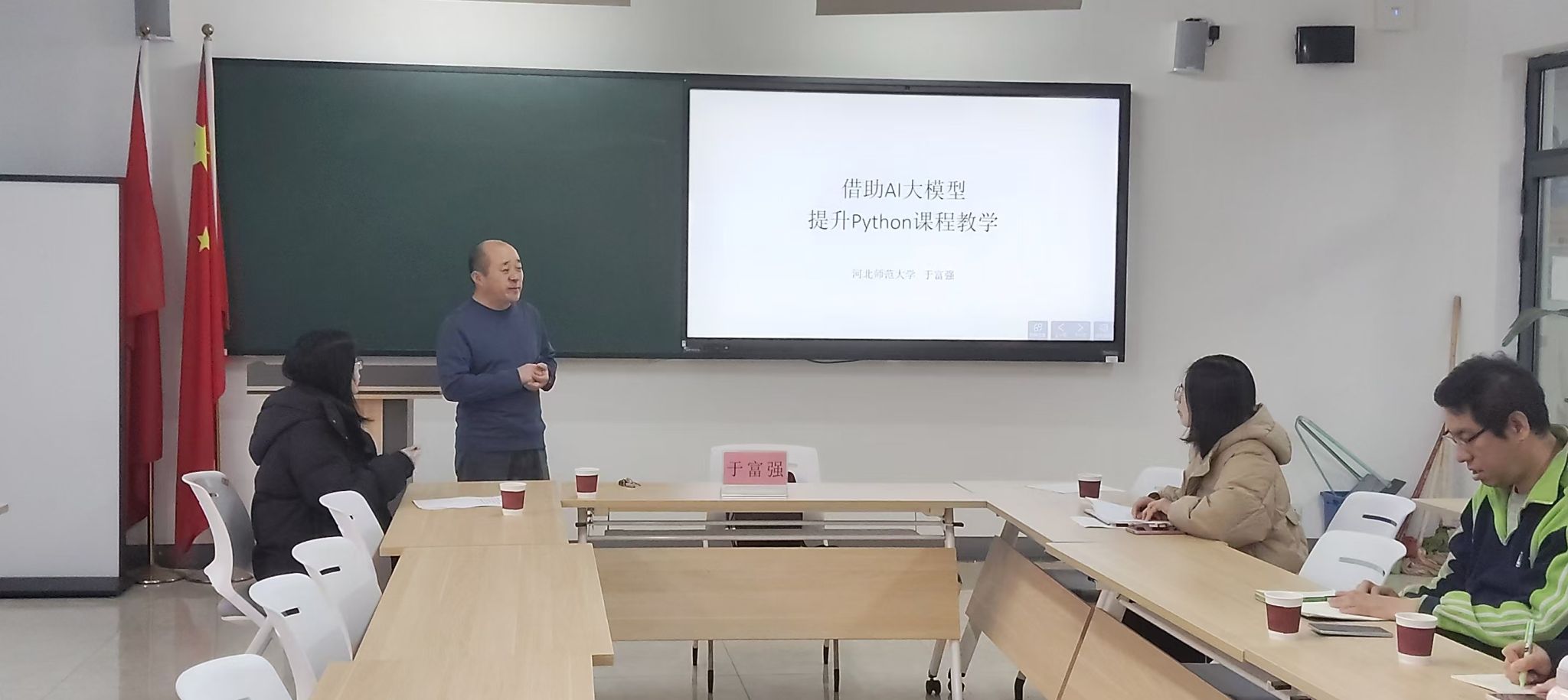 2024年12月19日上午9:00人工智能与大数据学院在次教216会议室举行了《借助AI提升Python课程教学》主题讲座,人工智能与大数据学院教学副院长林海霞、教学副院长孙劼、系主任及讲授Python课程相关老师参加。讲座由智能科学与技术系主任崔建弘主持。系主任崔建弘致欢迎词,对于富强教授的到来表示热烈欢迎,并对现场教师们强调,要珍惜机会,认真聆听;要积极参与,互动交流;要学以致用,推动Python教学工作稳步发展。