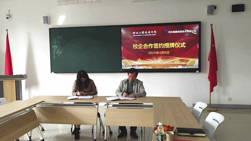 2025年04月09日上午08:30 - 09:30,河北工程技术学院与河北瑞鑫信息技术有限公司校企合作协议签约仪式在学校4 - 512会议室隆重举行。此次签约标志着双方在人才培养、产教融合等领域开启了深度合作的新篇章。