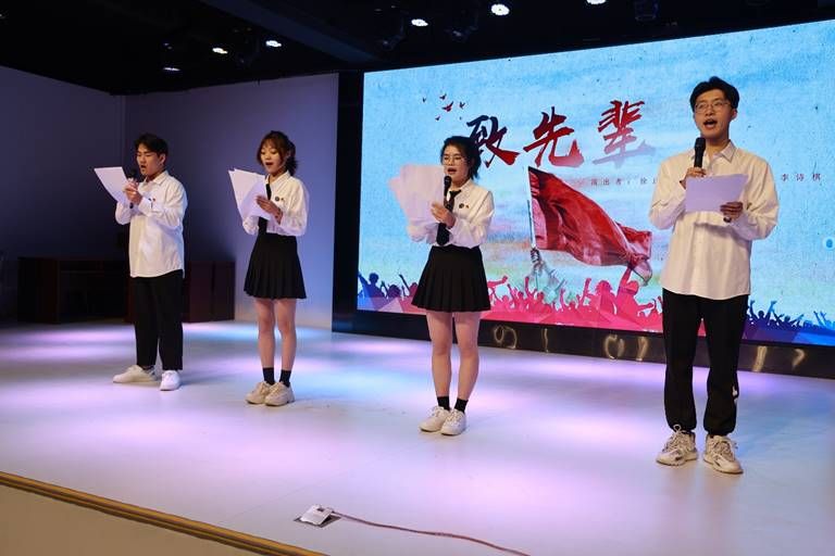 “振臂一呼惊敌胆,挺胸昂首摇旗帜。永难忘、热血洒山河,丰碑砌。” 徐远航、李一夫、郝妍、李诗棋为大家带来的诗朗诵《致先辈》极具震撼力和感染力,诗词振奋人心。