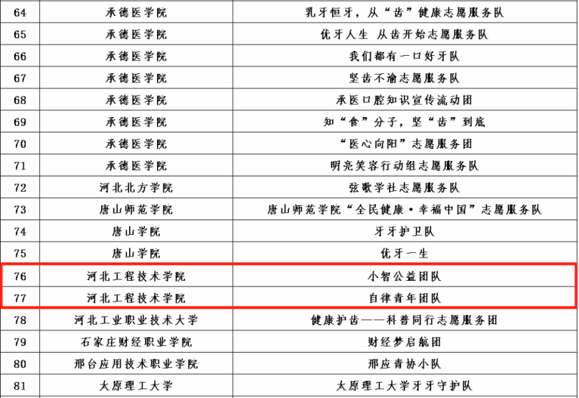 为深入学习宣传贯彻习近平新时代中国特色社会主义思想和党的二十大精神,落实《“健康中国2030”规划纲要》和《健康口腔行动方案(2019-2025年)》,引导青年学生掌握口腔健康知识,形成良好的口腔健康行为,团中央青年志愿者行动指导中心、国家卫生健康委医疗应急司联合发布了《关于遴选2023年全国大学生口腔健康志愿宣讲团的公告》。活动得到了各高校志愿服务团队的广泛关注和积极参与。主办单位对所有材料进行了认真审阅,最终在2023年10月20日“中国青年志愿者”微信公众号公布了遴选出的1000支大学生志愿服务团队。河北工程技术学院人工智能与大数据学院“小智公益团队”“自律青年团队”成功入选。