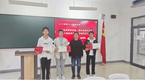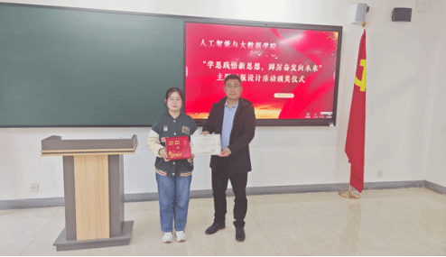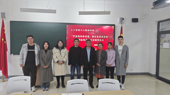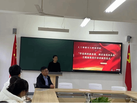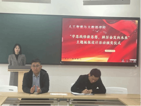 为深入学习宣传贯彻习近平新时代中国特色社会主义思想和党的二十大精神,着力加强青年思想政治引领和价值引领,在全体青年中掀起学习习近平新时代中国特色社会主义思想的浪潮,切实做到学深悟透、融会贯通,真正用于武装头脑、指导实践、推动工作,推动BEAT365官网大学生习近平新时代中国特色社会主义思想入脑、入心,人工智能与大数据学院于2023年11月7日下午在次教举行了“学思践悟新思想,踔厉奋发向未来”主题板报设计活动的颁奖仪式,参与本次活动的有人工智能与大数据学院党总支书记、学管副院长尹钧,马克思主义学院副院长苗正超,人工智能与大数据学院学管办主任、思政教研室副主任杨家腾以及获奖班级辅导员、学生代表,本次活动由人工智能与大数据学院思政教研室主任李亚鑫主持。