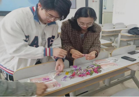 马克思主义学院教师路晓佳与班长毕荣鑫共同制作春花书签