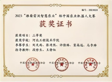 2023年荣获“潍柴雷沃智慧农业”杯中国农业机器人大赛国赛三等奖。