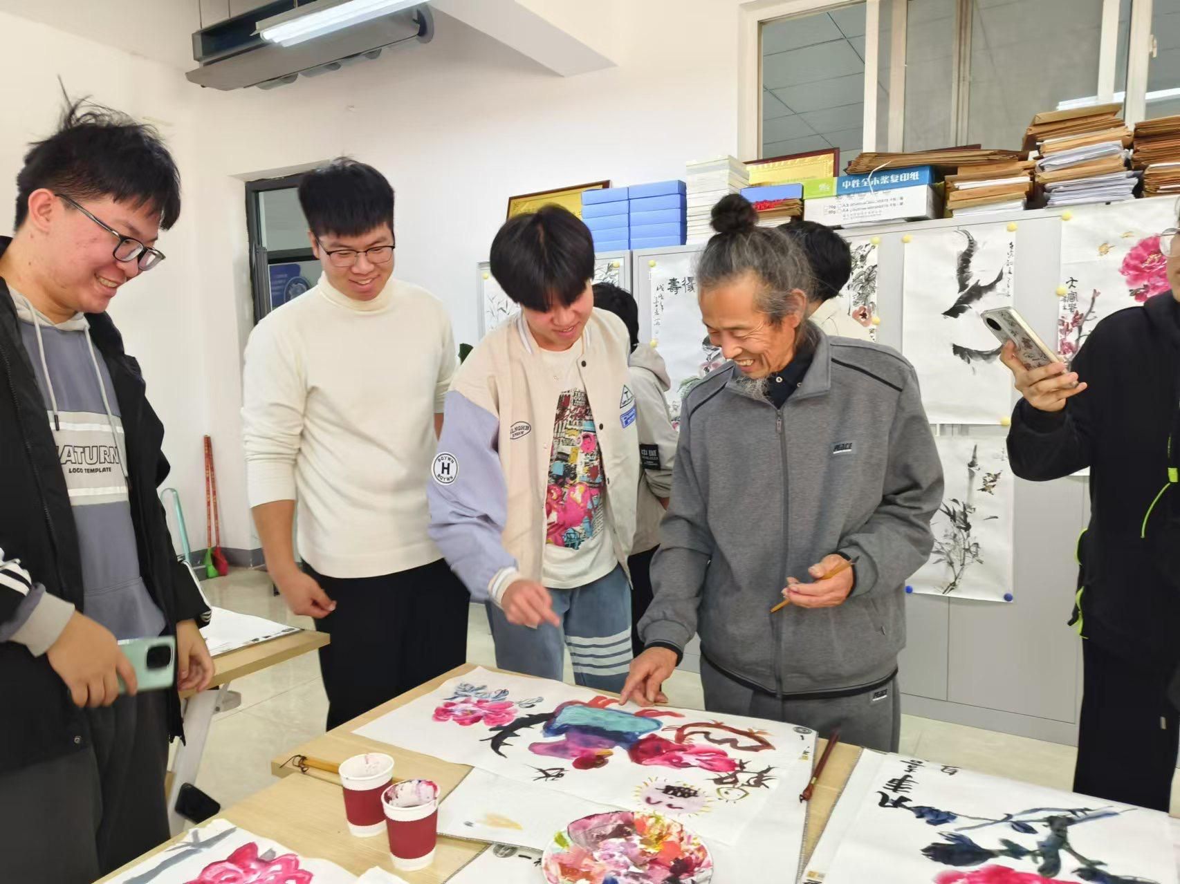 大师作画完成后,学生们分组开始作画,现场每一个人都热情满满,投入在自己的创作中。创作完成后,大师逐个对学生作品进行了指导,通过通俗易懂的讲解和示范,一幅幅精美的作品跃然纸上,学生们手持自己的作品与大师合影留念。