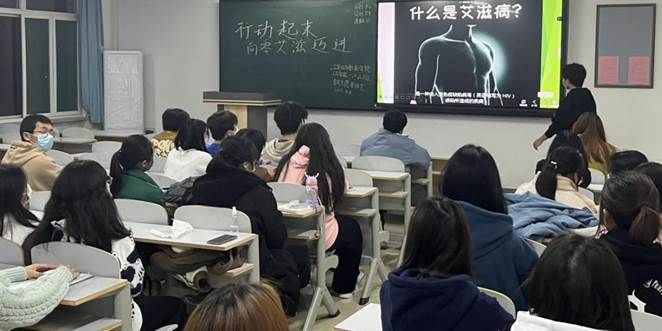 主讲员向学生讲述“预防艾滋病是全社会的责任”