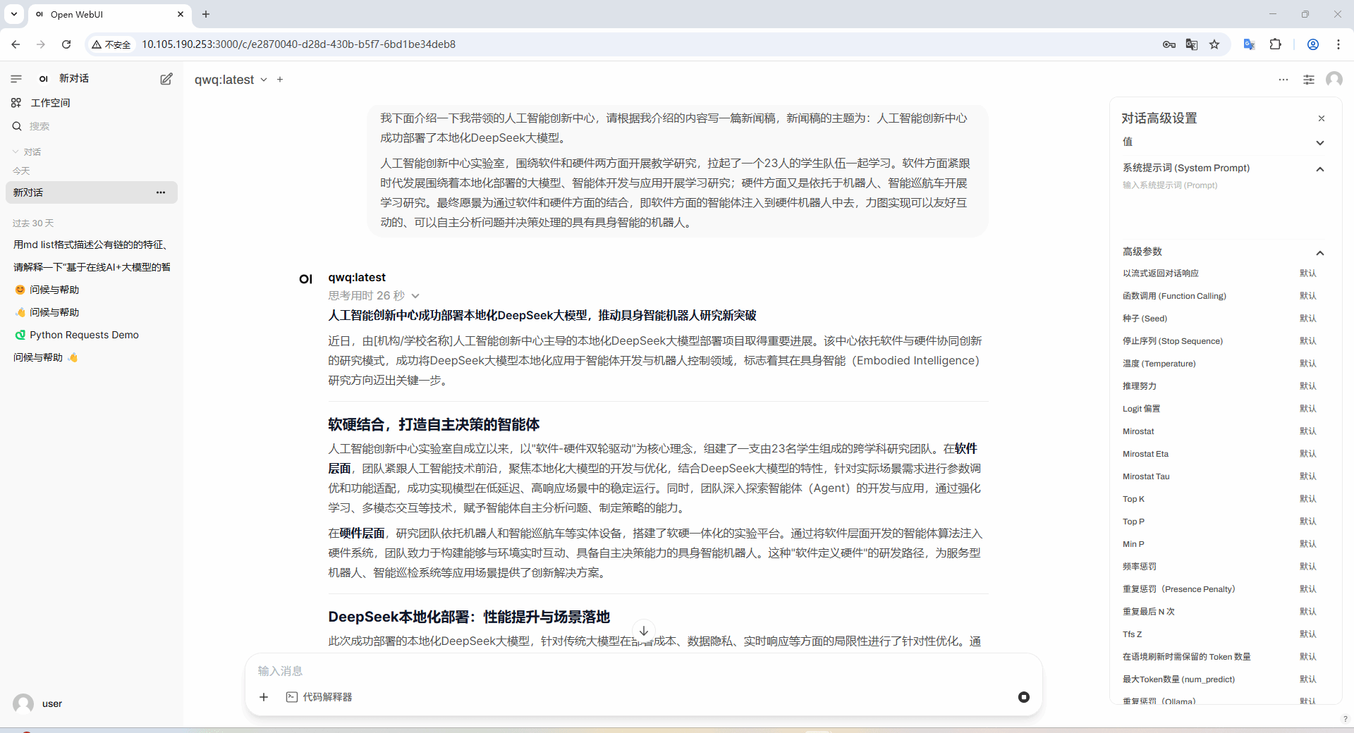 人工智能创新中心成功部署本地化DeepSeek大模型