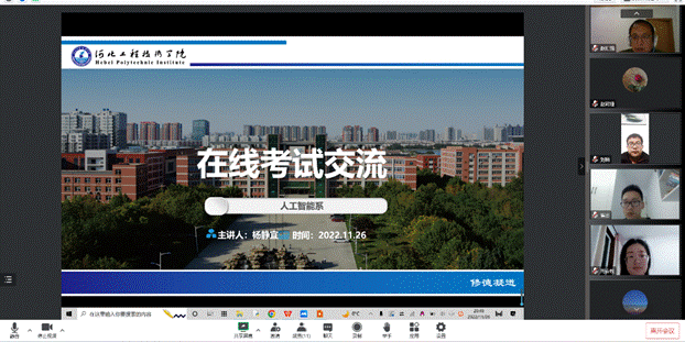 由于当前疫情形式严峻,本学期的期末考试由线下考试转变为线上的超星平台考试客户端考试。为了应对以上情况,11月26日20时,人工智能与大数据学院人工智能专业在腾讯会议线上平台举办了在线考试交流教学研讨会。人工智能专业全体教师参加了此次会议。